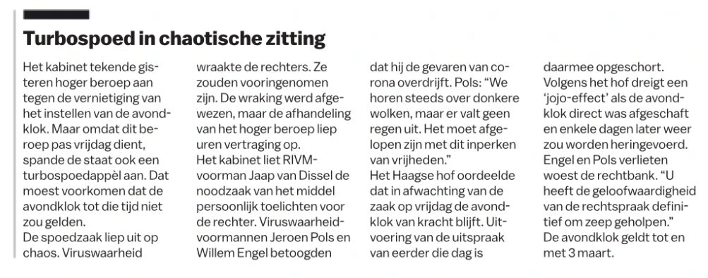 Het gerechtshof heeft in hoger beroep de uitspraak van de voorzieningenrechter inzake de avondklok vernietigd. Daarbij wer het volgende perbericht gegeven: